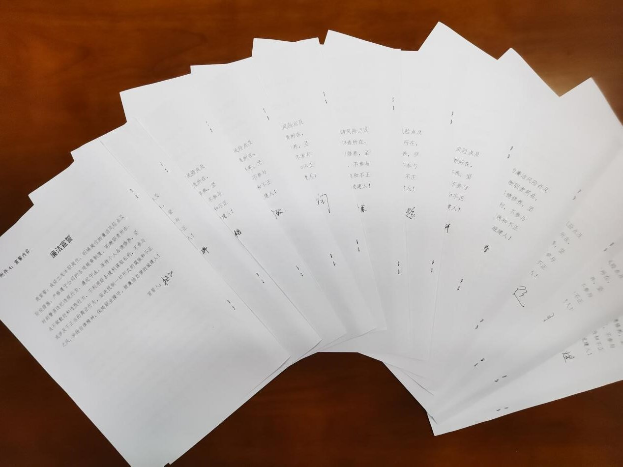 本次廉潔談話(huà)本著教育為先,預(yù)防在前的原則,向新員工宣讀了行賄受賄的相關(guān)法律,強(qiáng)調(diào)了廉政的重要性及必要性;下發(fā)了廉政教育手冊(cè),帶領(lǐng)各位新員工學(xué)習(xí)了中央八項(xiàng)規(guī)定和六項(xiàng)禁令、公職人員禁令和國(guó)有企業(yè)工作人員履職風(fēng)險(xiǎn)點(diǎn)等內(nèi)容,引導(dǎo)新員工在政治上、思想上、行為上保持頭腦清醒、思想清晰,做到嚴(yán)于律己、清正廉潔。會(huì)上,岳書(shū)記以集團(tuán)廉政標(biāo)兵繞子法和泰州市墓園主任陳進(jìn)的案例勉勵(lì)和警示新員工,他指出,反腐無(wú)僥幸,貪腐零容忍,要向榜樣看齊,向貪腐說(shuō)不,常懷律已之心。最后,共讀《新入職員工一封信》,新員工在廉潔宣誓書(shū)上莊重地簽下自己的名字,表明堅(jiān)守“廉之初心”的決心。