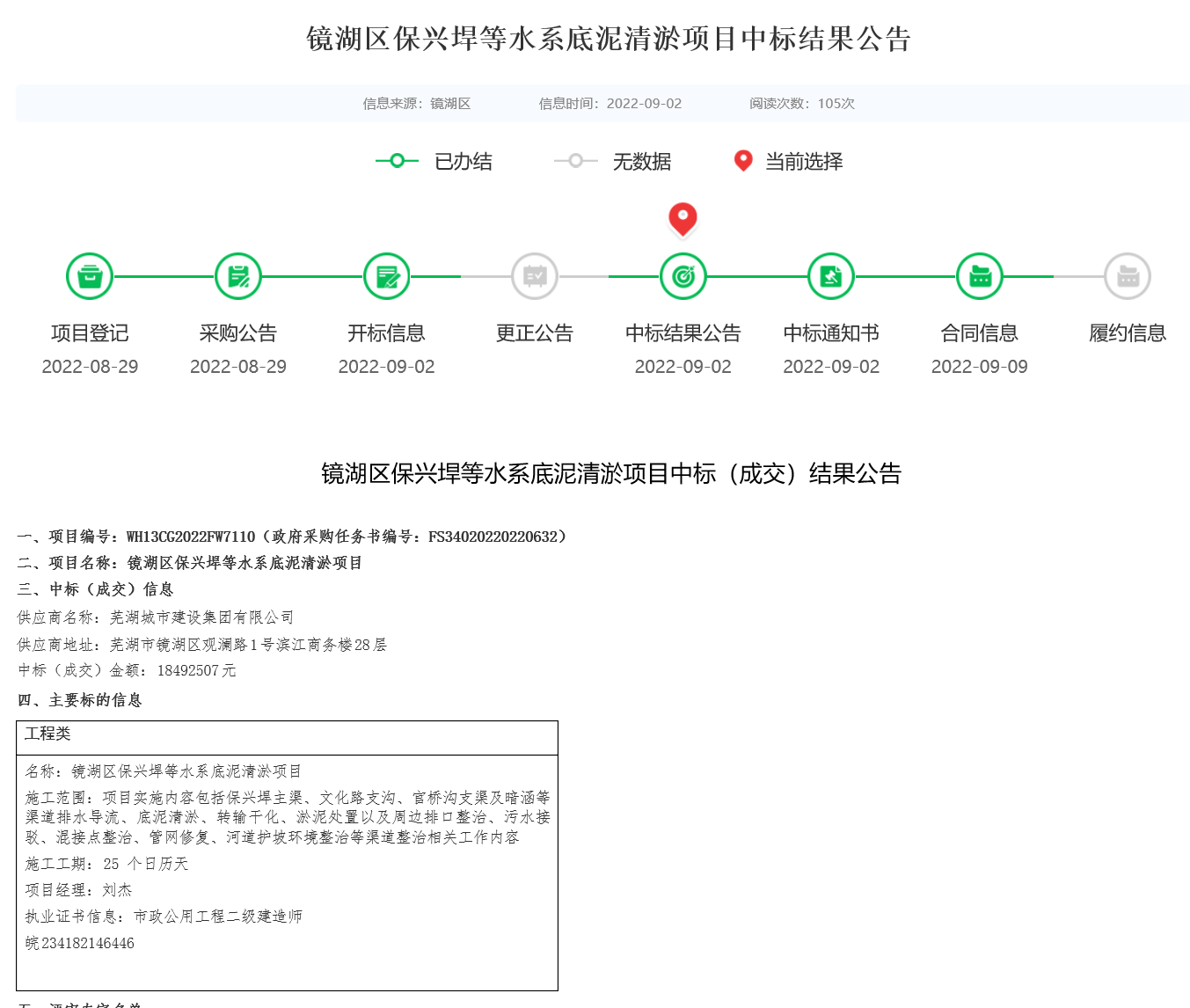 一分耕耘,一分收獲。9月,集團公司中標了鏡湖區(qū)保興垾等水系底泥清淤項目,中標額1849.25萬元。