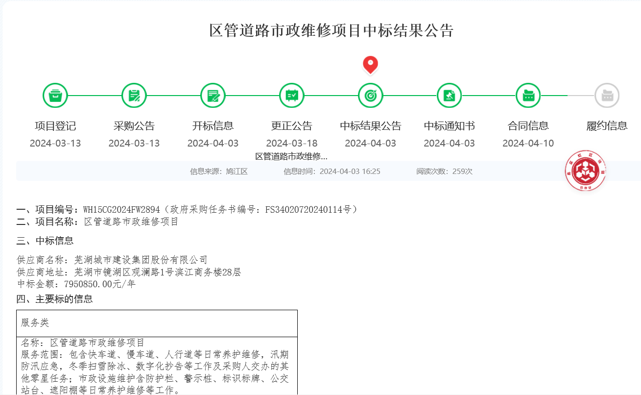 4月3日,蕪湖城建集團憑借豐富的養(yǎng)護經(jīng)驗和優(yōu)秀的綜合實力成功中標鳩江區(qū)區(qū)管道路市政維修項目,中標價795萬元/年,服務(wù)期三年,采用“1+1+1”養(yǎng)護模式,項目內(nèi)容包括所涉區(qū)塊的92條市管道路及附屬市政設(shè)施的日常養(yǎng)護維修和汛期防汛、冬季掃雪除冰等應(yīng)急工作。